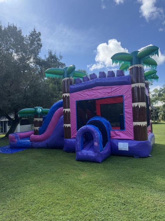 A vibrant inflatable with two side-by-side wide lanes for racing down the slide into a large pool , plus a spacious bounce area. —perfect for nonstop action.