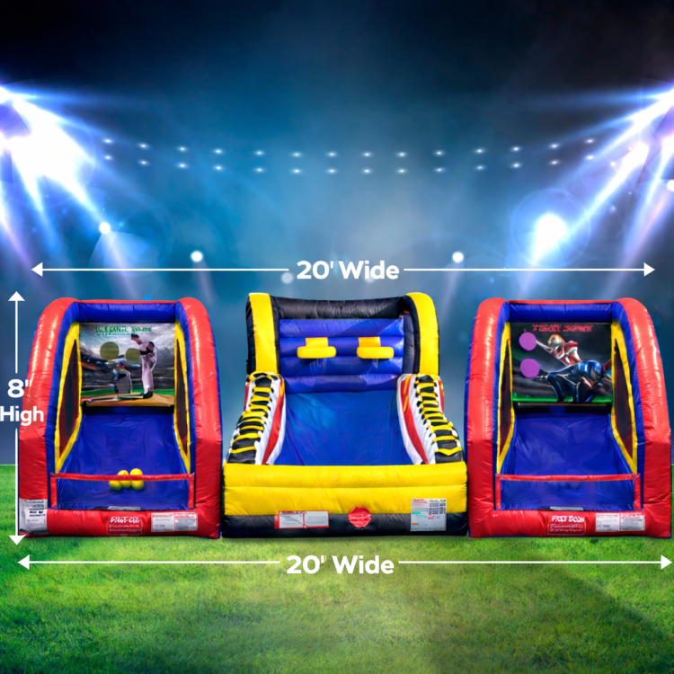 Turn your event into a full-blown sports showdown with the All-Star Sports Challenge inflatable game lineup! This high-energy setup features three popular sports games side by side: a baseball Strike Zone toss, a head-to-head basketball shooting challenge, and a First Down football throw. It’s the perfect way to create a competitive, carnival-style atmosphere that keeps guests moving and engaged.